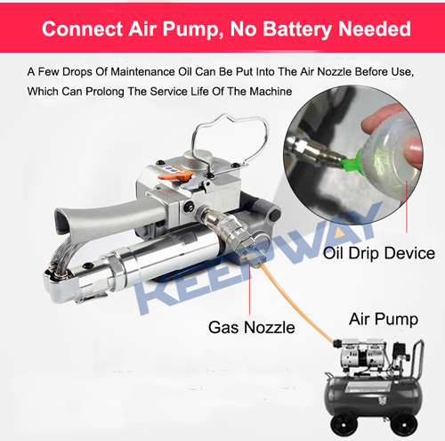 Pneumatic strapping tool /air strapping machine is a friction welding type strapping machine. The overlapping thermoplastic straps are combined by the heat generated by the friction movement. The principle is to use the strapping tape to strap the product or package, then tighten it and melt the two ends through the thermal effect or use the package. Machines connected with buckles and other materials.